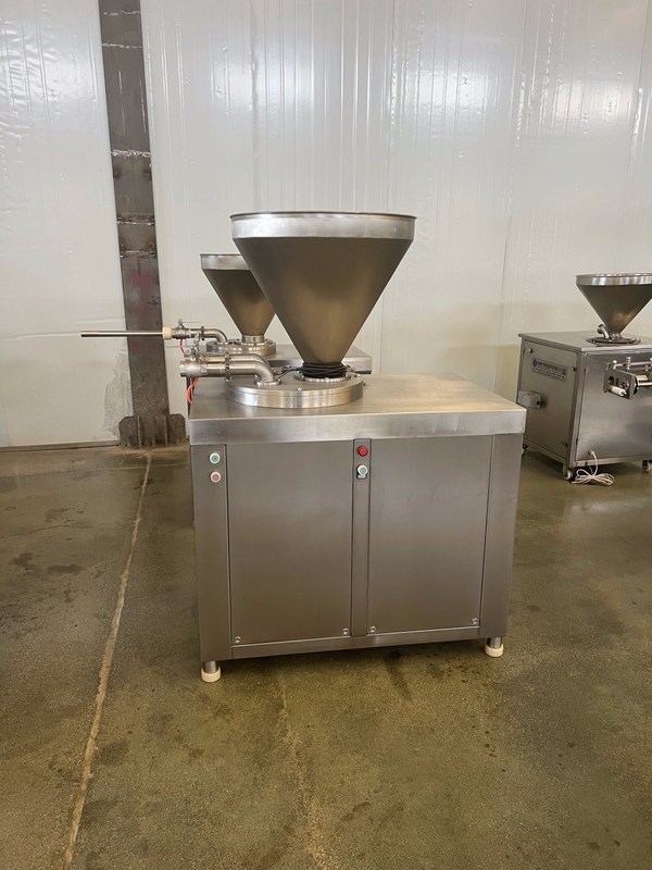 Eine Fleischklistermaschine oder eine Fleischfüllmaschine oder Würstchenfüllmaschine wird in der Lebensmittelindustrie verwendet, um Hüllen mit gemahlenen Fleischmischungen zu füllen.Diese Maschine wird häufig verwendet, um verschiedene Arten von Würstchen und andere gefüllte Fleischprodukte zu produzierenDas Verfahren besteht darin, die Maschine mit der zubereiteten Fleischmischung zu beladen, die dann durch eine Düse in ein Gehäuse, typischerweise aus natürlichen oder synthetischen Materialien, gedrückt wird.